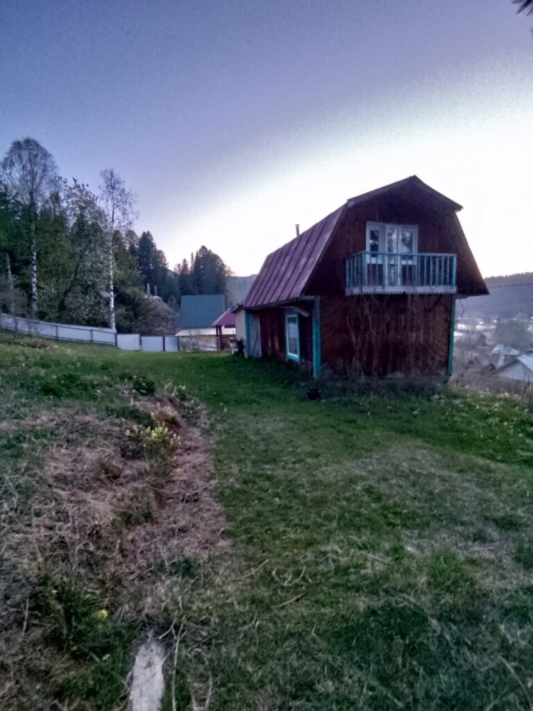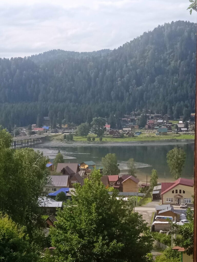 Усадьба расположена на краю высокой террасы в с. Иогач, что позволяет наслаждаться панорамным видом на Телецкое озеро, исток Бии и горы.